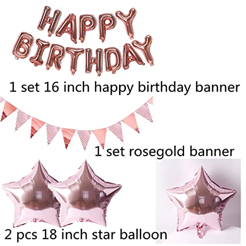 - 🎈26. Set de decoración de cumpleaños de oro rosado: 1 juego de 13 pancartas de oro rosa de 16 pulgadas, 2 globos de estrella de 18 pulgadas, globos de estrella de 32 pulgadas, 6 globos de confeti de color oro rosa de 30 cm, 1 guirnalda de banderines (12 unidades), 1 cinta