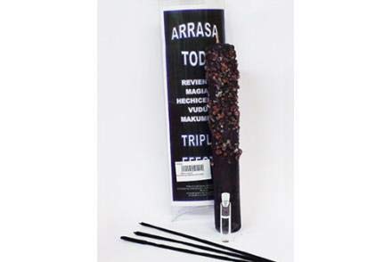 - La veladora arrasa con todo es muy útil para destruir todo tipo de magia negra, hechicería, vudú, etc.Viene con aceite litúrgico, incienso e instrucciones.