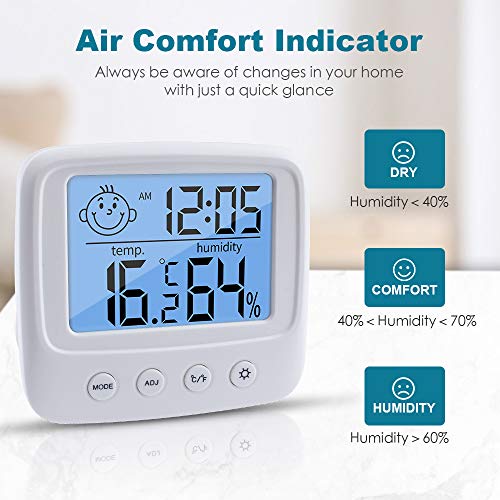 Termómetro Higrómetro Digital, Medidor de Temperatura para Medición de Temperatura y Humedad del Casa Ambiente con luz de Fondo, Reloj y función ℃ / ℉
