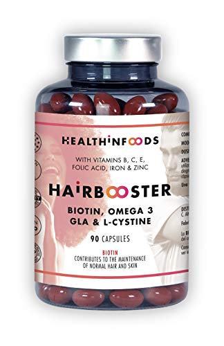 - UÑAS, PIEL Y CABELLO SANO: la combinación sinérgica de ingredientes naturales del suplemento Hairbooster de Healthinfoods te aporta el complemento que necesitas para el crecimiento del cabello, las uñas y el mantenimiento de una piel sana e hidratada. Las Vitaminas C y E y el Zinc de nuestra fórmula actúan como potentes antioxidantes, protegiéndote de los radicales libres y favoreciendo la absorción del hierro y la producción de colágeno.