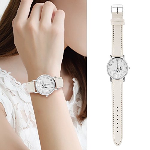Sonew Reloj de Cuarzo de Las Mujeres Reloj de Pulsera analógico Femenino Redondo Correa de Cuero de la PU Reloj de diseño de Mariposa Simple de la Manera(White)