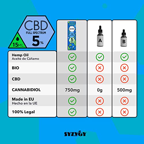 - 💰 ¿CBD OIL DE LA MEJOR CALIDAD AL MEJOR PRECIO? ¡DALO POR HECHO! El aceite de cbd SYZYGY viene en un frasco de 15ml que contiene 1200 Drops. Cada envase tiene 750mg de Cannabidiol de la mejor calidad. Es rico en Cannabidiol, aceites esenciales Omega-3-6-9 y Vitaminas. Si necesitas aceite de CBD para mezclar con tu crema habitual, ¡este es tu aceite!