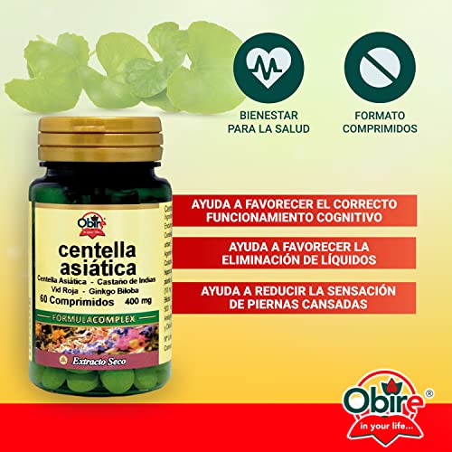 Obire | Centella Asiática COMPLEX 400 mg | Suplemento Alimenticio de Castaño de Indias, Vid Roja, Ginkgo Biloba y Vitamina B-6 | Favorece la Circulación y Eliminación de Líquidos | Cápsulas Vegetales