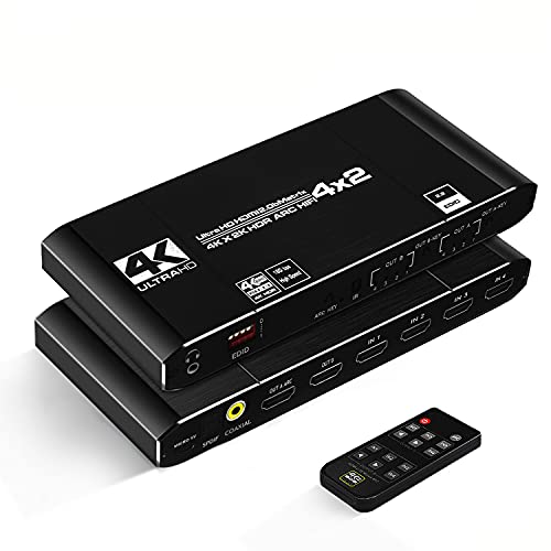 HDMI Switch 4K @ 60Hz,KuWFi Conmutador de HDMI Matrix 4 en 2 salidas HDMI Matriz 4x2 SPDIF 5.1CH & Salida óptica & L/R 3.5 mm Soporte ARC HDCP2.2,HDMI2.0b,4K HDR Auto EDID, Mando a distancia IR