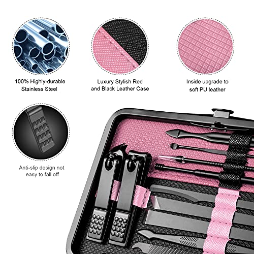 Set Manicura Pedicura 18 Piezas Profesional Cortaúñas Acero Inoxidable - Manicura y Pedicura Limpiador Cutícula con Caja de Cuero (Negro Rosa)