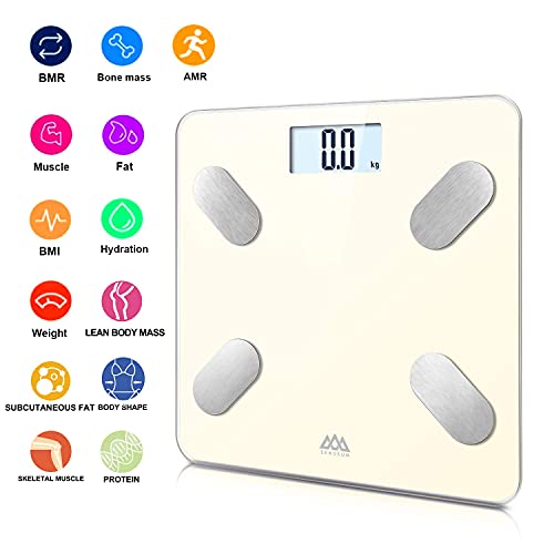 SENSSUN Bascula de Baño Digital Grasa Corporal,balanzas digitales bluetooth,Analiza la composición corporal,con 13 Funciones,IMC/músculo/grasa corporal/masa ósea(Blanco crema)