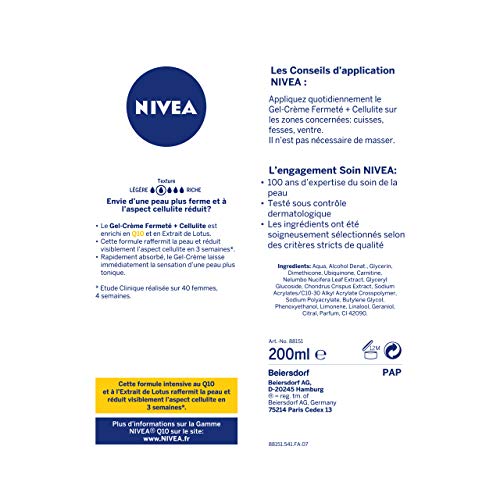 - Contenido del envío: NIVEA Q10 Plus Gel-Crema Anticelulítico + Reafirmante, crema anticelulítica para conseguir una piel más firme, 1 x 200 ml, tubo