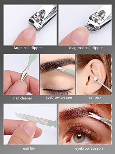 - âïž ăMULTIUSOSă Nuestro kit de manicura contiene cortaĂșñas, cortaĂșñas diagonal, tijeras para cejas, pinzas para cejas, palillo para orejas, lima de uñas y un tenedor para piel muerta. Este kit de cortador de uñas puede satisfacer todas sus necesidades de cuidado de manos, rostro y pies, sin necesidad de comprar herramientas adicionales.