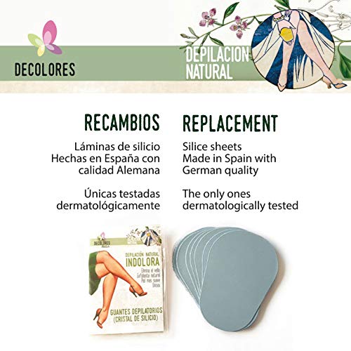 - CARACTERÍSTICAS: Guantes Depilatorios con láminas a base de cristal mineral de silicio. Depilación indolora, fácil, natural, rápida. Elimina el vello y las células muertas, dejando la piel perfecta y más suave tras su uso. Existen en formato facial y corporal, siendo válidos para todo el cuerpo, aunque especialmente indicados en cara, piernas y brazos. Cada repuesto dura de 3 a 5 depilaciones completas. Utilizado con regularidad debilita y retrasa el crecimiento del vello.