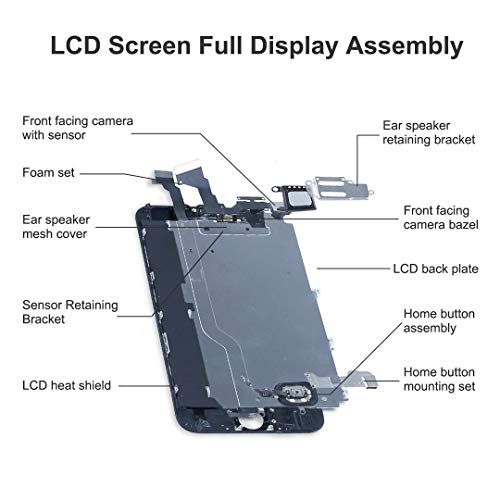 - 【Embalaje】- El paquete incluye el conjunto de pantalla LCD completa del iPhone 6s Plus con botón de inicio, cámara frontal, altavoz auricular, sensor de proximidad y herramientas de reparación. AVISO: el botón de inicio se incluye en la pantalla, pero solo el original tiene la función Touch ID. Puede transferirlo desde la pantalla original a la nueva pantalla LCD.