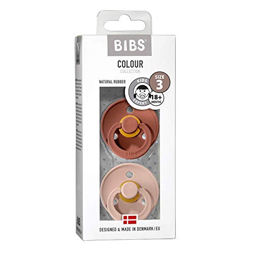 BIBS Colour Paquete de 2 chupetes. Libre de BPA, Tetina redonda. Látex natural, Talla 3 (18 + meses), Woodchuck / Blush