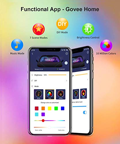 - Two Simple Control Métodos: Olvídese del mando a distancia lo que fácil de perder, le ofrecemos un controlador más conveniente y de moda, disfrutar de cambiar el color, el brillo, el modo de música. Y puedes pegar el controlador en la parte de al lado para un viaje de seguridad. Además, puede utilizar la aplicación "Govee Home" para controlar la luz.