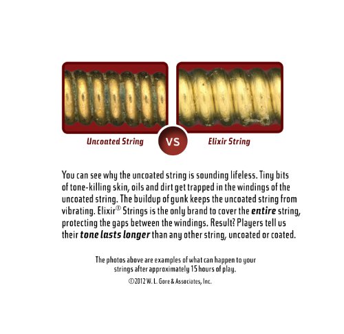 - Cuerdas ElixirStrings protege el Área Crítica del Sonido contra la corrosión y la acumulación de residuos. Timbre constante de alta calidad, de 3 a 5 veces más larga que la de las cuerdas convencionales. Las cuerdas se mantienen limpias dando la sensación de siempre nuevas.