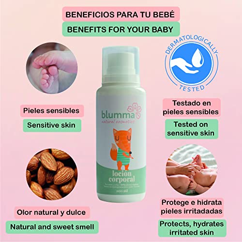 - Loción corporal hidratante para el cuidado diario de la piel del bebé con ingredientes de origen natural que hidrata, protege y suaviza la piel, su textura ligera se extiende muy fácilmente y se absorbe rápidamente sin dejar la piel pegajosa