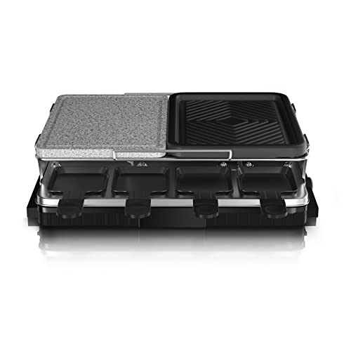 - GRILL RACLETTE MULTITALENTE: La máquina de grill multifuncional contiene 2 opciones de grill. Hay una placa de piedra natural aislada hecha en material de roca volcánica y una parrilla de diseño tridimensional con textura. Hay 8 mini sartenes debajo del tubo de calentamiento que le permiten a usted y a sus amigos freír alimentos convenientemente.