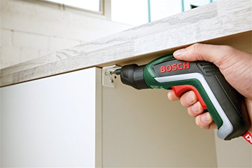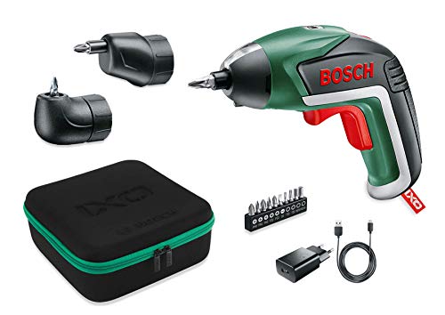 Bosch IXO Set Atornillador a batería Accesorios angular y excéntrico, 10 puntas para atornillar, cargador USB, estuche de espuma, 3.6 V, 1.5 Ah