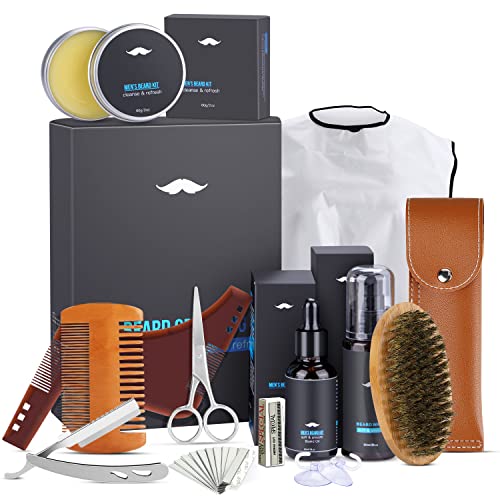 - 【Juego 10 en 1】 Nuestro juego de barba contiene lavado de barba, bálsamo para barba, aceite para barba, peine, cepillo, maquinilla de afeitar, tijera, plantilla para moldear la barba, babero, maquinilla de afeitar. Es la herramienta perfecta para el cuidado de la barba masculina.