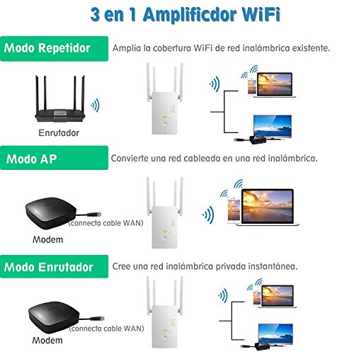 - 【3 EN 1 REPETIDOR SEÑAL WiFi】--①Modo AP: convierte una red cableada en una red inalámbrica.②Modo de enrutador: cree una red inalámbrica privada instantánea y permita que varios dispositivos la compartan.③Modo repetidor: amplía la cobertura WiFi de una red inalámbrica existente.