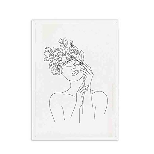 Sobre lienzo Cabeza de planta Mujer Lámina Mujer con flores de flores Imágenes de pared en blanco y negro para la decoración del hogar de la sala de estar 40x50cm (15.7 "x19.7") x3 Sin marco