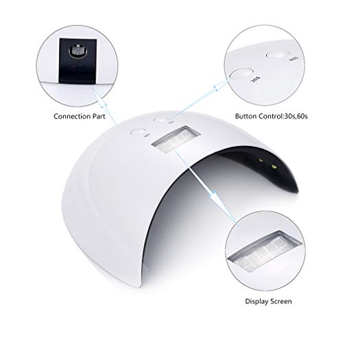 - ă4 TEMPORIZADOR Y 36 LEDă4 configuraciones de temporizador: 10s / 30s / 60s / 120s, modo de calor bajo para que pueda elegir segĂșn las necesidades de bricolaje. 36 LED se distribuyen uniformemente en el interior para ayudar a curar uniformemente el esmalte de uñas de gel. La luz natural del LED no daña las manos y los ojos.