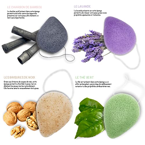 Esponjas faciales orgánicas de Konjac asociadas con té verde, carbón vegetal, lavanda y cáscaras de nuez | Juego de 4 esponjas en forma de gotas | Esponja vegetal limpiadora natural