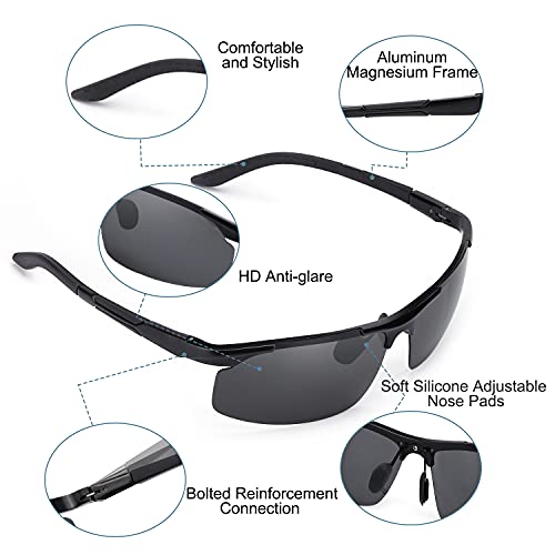 TJUTR Gafas de sol polarizadas deportivas para hombres de conducción de béisbol, pesca, ciclismo, correr, golf, motocicleta, tac, protección UV400, Marco rectangular negro/lente polarizada gris,