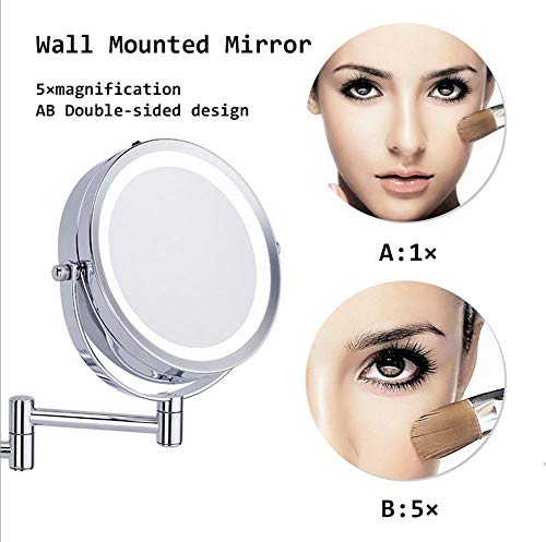 Espejo de Afeitar para baño Espejo de Maquillaje de 8.5 Pulgadas montado en la Pared con Luces LED y Espejo de tocador de Aumento 5X Brazo Extensible de rotación Libre de 360 ° Funciona co