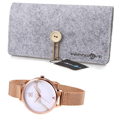 Alienwork Reloj Mujer Oro Rosa Banda de Malla Metálica Blanco Ultra-Delgada Elegante