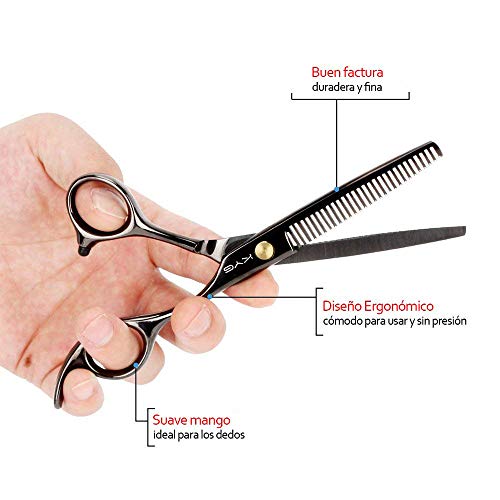 - ✄Estilo simple & Diseño ergonomico: ❶Diseño de agarre desplazado: muy ergonómico y reduce la fatiga ❷Diseño de tijeras entresacar de 27 dientes: afilado y sin pelo atrapado entre las cuchillas (tasa de adelgazamiento del 25-28%) ❸Diseño de silenciador de alto rebote: reduce el ruido metálico y la fricción de las tijeras ❹Diseño de tornillo ajustable: ajuste la tensión de las tijeras según la sensación personal.