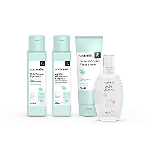 - Precioso neceser de tela formato viaje con todos los productos básicos para el cuidado de tu bebé: Gel-Champú Espumoso 100ml + Crema Pañal 75ml + Nueva Baby Cologne 500ml + Loción Hidratante 100ml.