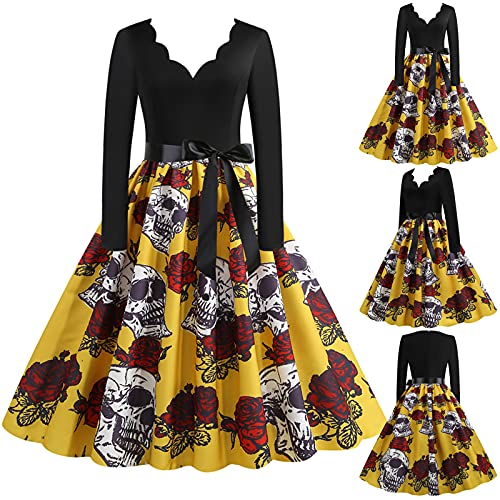 - ღDisfraz de Halloweenღ: Vestido de manga larga con estampado de calavera de Halloween para mujer. Novedad y diseño creativo. Una idea de Halloween súper aterradora aunque extremadamente sexy, te traerá una experiencia maravillosa e interesante. Gran idea de disfraces para la fiesta de Halloween, la fiesta de cumpleaños, el juego de simulación, el cosplay, el baile de graduación, el crucero o cualquier disfraz de fiesta.