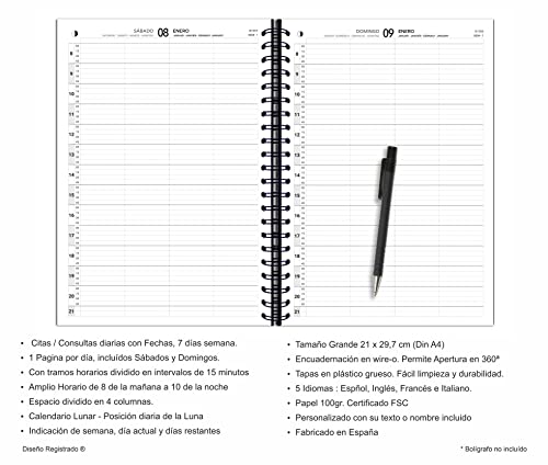 - 2 columnas y 200 páginas: con 200 páginas (100 hojas) y 2 columnas por página (se abre a 4), este calendario libro proporcionará un sinfín de días de citas.