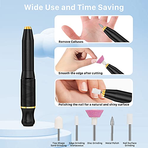 - El archivo de taladro para uñas incluye 5 accesorios profesionales para suavizar callos y callos, eliminar el exceso de cutículas y limar, dar forma y pulir las uñas. El tamaño pequeño de la pluma portátil se puede guardar y guardar fácilmente.