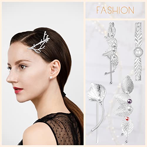 - Delicado y elegante: los pasadores plateados decorativos de metal adoptan una variedad de elementos de hojas y los combinan con perlas de imitación y pedrería, se ven simples pero elegantes, llenos de delicadeza y gracia; Usarlos puede traerte más encantos y cumplidos