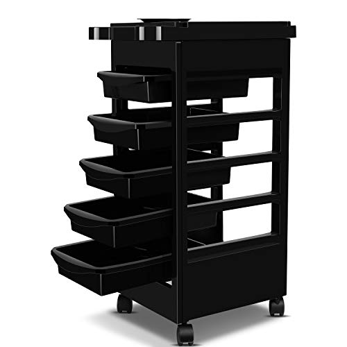 - 5 correderas de cajón estilo bandejas para herramientas y accesorios de belleza: Este carro de rollo sobre con 5 cajones anchos que le permiten colocar una amplia gama de herramientas de belleza, cosméticos y suministros de peluquería
