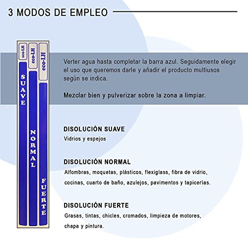 - ¿Cómo se usa? Debemos diluir en agua nuestro producto según la suciedad que haya que limpiar. En el dosificador ECO-LH encontraremos tres usos: suave, normal y fuerte. Deberemos verter agua hasta completar la barra azul (en fotos adjunta) y seguidamente elegir el uso que queremos darle y añadir el producto multiusos según se indica. Mezclaremos bien y pulverizaremos sobre la zona a limpiar. Se puede usar en cocinas, baños, salones, coches, pavimentos, lavadora, sofás, alfombras, etc.