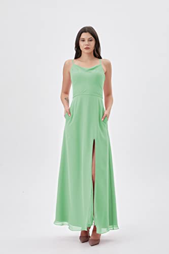 Atlxdres Cuello de Capucha Vestido Boda Mujer Ajustable Correas de Espagueti División Frontal Gasa Largo Vestido de Fiesta con Bolsillos Verde Menta