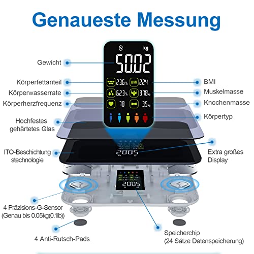 - 15 Análisis de la composición corporal: esta basculas de baño grasa corporal puede medir y analizar con precisión el peso corporal, el IMC, la grasa corporal, el agua corporal, la masa muscular, la densidad ósea, la grasa subcutánea, la grasa visceral, etc. Le ayuda a conocer el estado de su cuerpo de forma íntegra. Además, al supervisar su frecuencia cardíaca, la basculas de peso baño puede orientarlo para que establezca su entrenamiento de forma adecuada y alcanzar un estado más saludable.