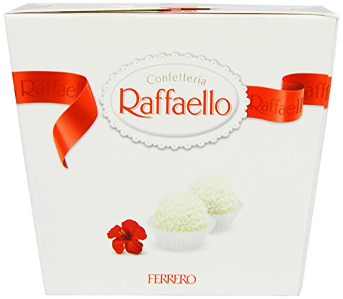 - Raffaello 230 g – Caja de regalo con bombones envueltos individualmente (aproximadamente 23 unidades) de coco, crema de leche y almendras enteras. Sin colorantes.