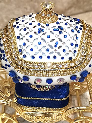 - ❤ Corona Regal estilo huevo de Fabergé de 10 quilates con diamantes de Swarovski, carruaje de zafiro de 180 diamantes de Swarovski, 80 gemas de Swarovski, Fabergé auténtico huevo de ganso natural adornado a mano con oro de 24 quilates. Trinquete musical "Castillo en el cielo" que simboliza la esperanza, la ambición y el amor por un futuro mejor. El interior está forrado a mano con seda, por lo que es un lugar ideal para almacenar tus joyas. Cada huevo tiene soporte de metal dorado de 24 quilates, 13 cm x 11 cm x 5 cm