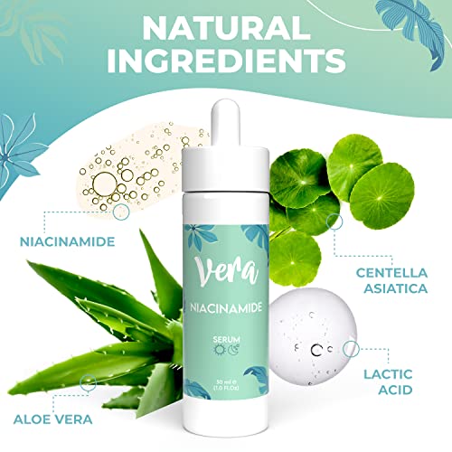 Vera Serum Niacinamida con Acido Lactico - Serum Piel Grasa y Mixta para Reducir Poros Abiertos Cara - Niacinamida Serum Acne, Controla Producción de Sebo - Niacinamide Serum Iluminador Facial, 30ml