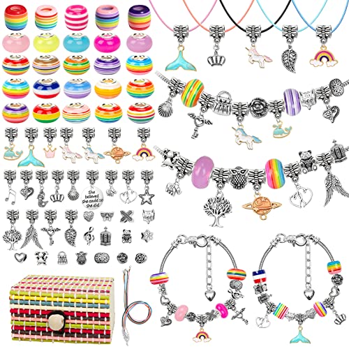 - Kit de pulseras para niñas incluye 15 cuentas de colores del arco iris, 15 cuentas de metal, 5 cuentas luminosas y 5 cuentas rayadas, 13 dijes colgantes de metal plateado, 7 colgantes de colores, 5 collares y 2 pulseras. Este kit de joyería para niñas es perfecto para las niñas que aman las joyas de bricolaje. Las niñas estarán felices de encontrar cuentas de metal y varios patrones de colgantes.