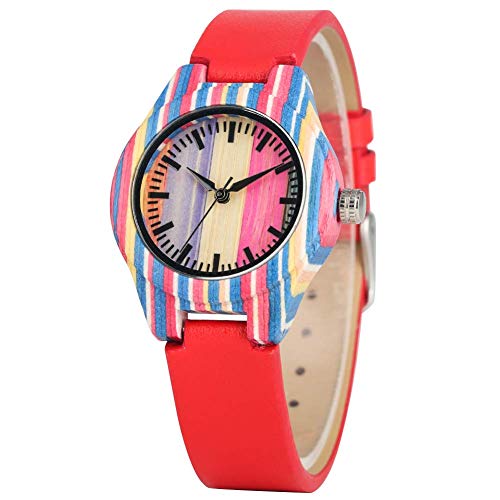Yxxc Reloj con Correa de Hebilla roja con Esfera Colorida y Concisa para Dama, Relojes de Madera de bambú súper livianos para Mujeres, Reloj de Pulsera de Madera de Cuarzo Informal para