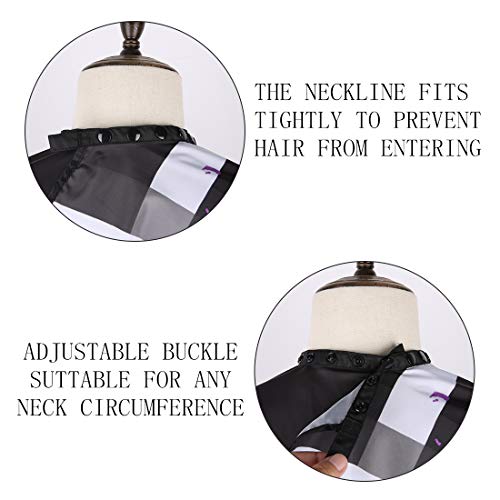 - Cierre a presión ajustable: el cierre de presión ajustable hace que sea adecuado para cualquier tamaño. Capa de corte de pelo incluye lazo cosido para colgar, el cuello se ajusta perfectamente al cuello y puede evitar que el cabello se caiga y te hace sentir cómodo y disfrutando mientras te corta el pelo.