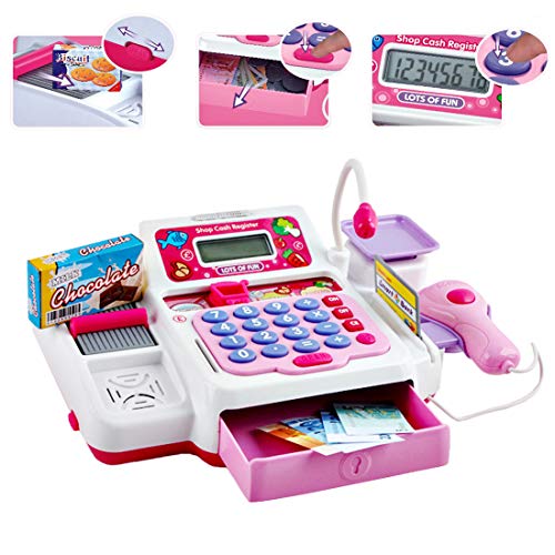 deAO Caja Registradora Electrónica de Juguete con Escáner, Micrófono, Cinta y Lector de Tarjetas Conjunto de Accesorios de Tienda y Supermercado Infantil Incluye Alimentos de Juguete (Rosa)